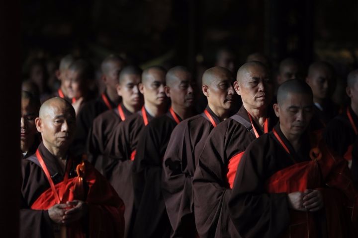 “诵经行道雁行游”是说诵经的时候,或者是绕佛走路的时候,要像天上的飞雁,很规律、很整齐地排列成行,而不是散乱漫走。而且大家都是统一的姿势、统一的动作。试想,这是多么的威仪庄严啊。